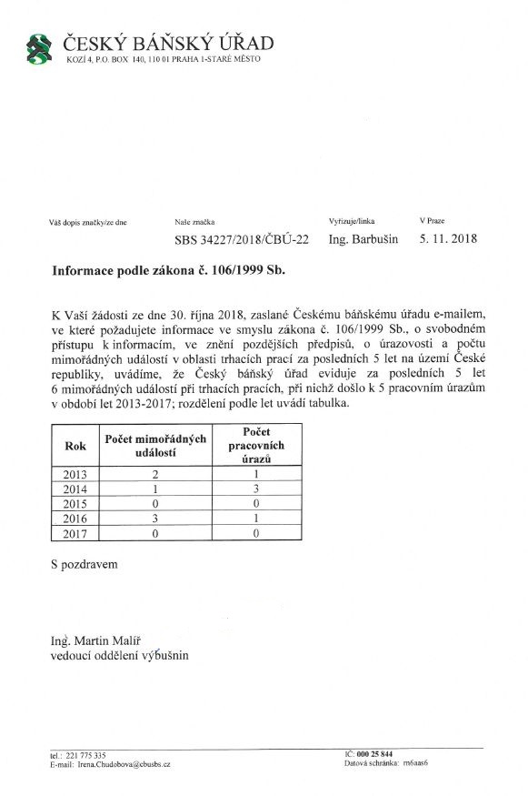 Žádost o úrazovosti a mimořádných událostech v hornictví při těžbě kamene.