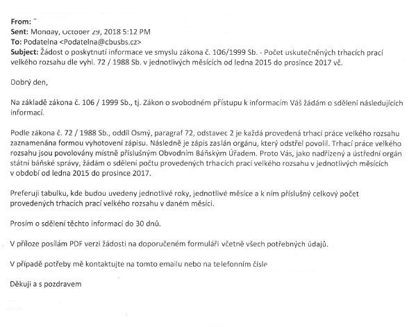 Žádost o poskytnutí informací a dokumentů, týkajících se hornické činnosti v dobývacím prostoru Lubná II