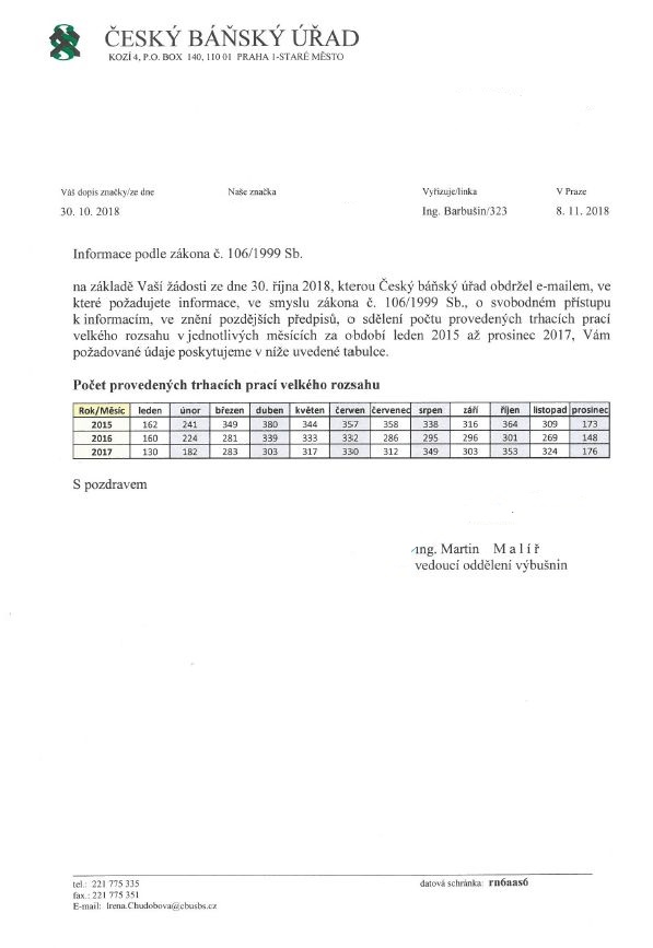Žádost o informaci o sdělení počtu provedených trhacích prací velkého rozsahu v jednotlivých měsících za období leden 2015 až prosinec 2017.